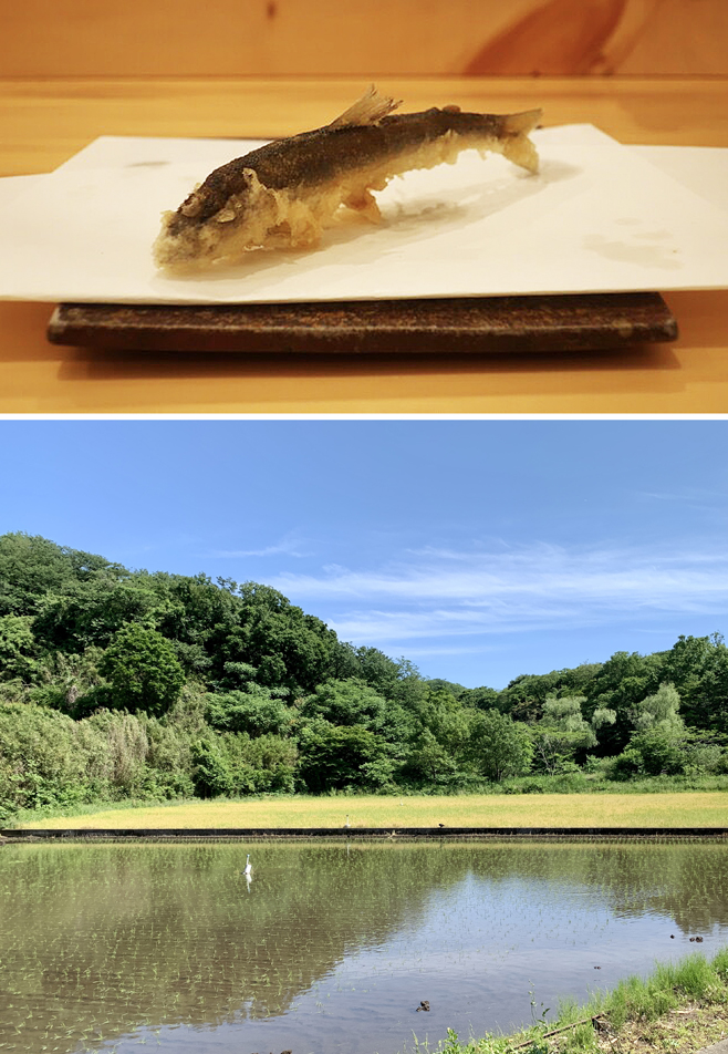 店はカウンターだけで店主と客が向かい合いミニ懐石を頂くだけだが、全国各地の旬の食材を和食の技術を駆使して順番に客に提供する。ゆっくりと提供されるので会話をする邪魔にならない。各地から届いたクロムツなどの刺身、ノドグロの椀、熱々の車海老や若鮎の天ぷらの旨いこと、〆に店主が立てた茶が供される。