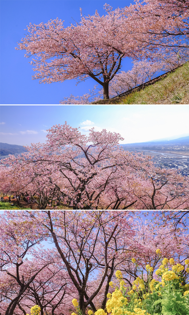 山の傾斜地は9分咲きの河津桜で埋め尽くされ、遠くに箱根の山並みそして小田原の街と海を見渡せる絶景が広がっていて素晴らしい。河津桜はその鮮やかなビンク色が菜の花と重なると春の幸福感を与えてくれる。