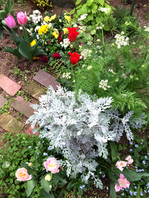 今まで見たこともない新しい品種の色々なチューリップが庭のあちこちに咲き、加えて可憐な忘れな草やイギリスで購入したタネから発芽し越冬したキャラウェイなども咲き小さいながらイングリッシュガーデンの趣きになった。