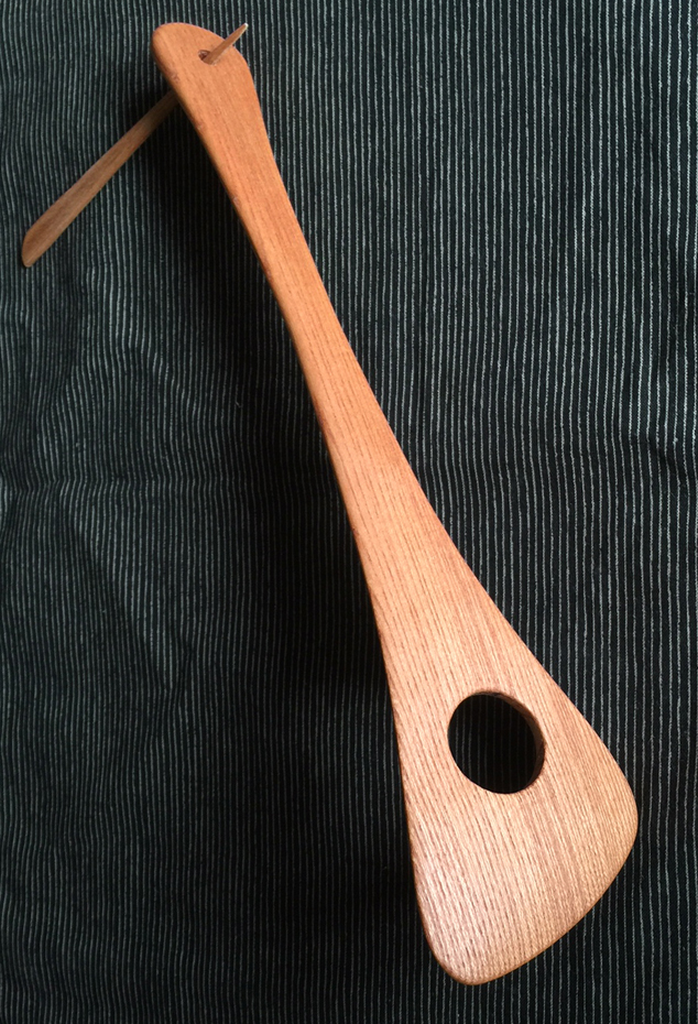 用の美、生活を豊かにしてくれる道具たちへの称賛の言葉、道具は機能的に使いやすいものでなくては長くは使って貰えないが、加えて使いたくなるような美しさが備われば良いなと思う。使いやすさは自宅で使いながら改良していけるが、美しさは作り手の感性そのものが滲み出てくるようなもので奥が深いし、自己満足で終わってしまうかも知れない。写真は今回の作品の一つのタナー(鍋をかき混ぜる調理道具)であるが、欅の柾目を使い軽くて手に馴染み使い易いそして美しい形を追求して見た。