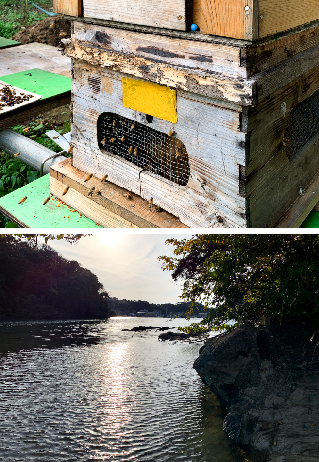 剣崎へ行く幹線をはなれ狭い畑道を登って行くと三浦海岸の素晴らしい景色である大根畑の横の山の途中に畑がありそこに西洋蜜蜂と日本蜜蜂の巣箱が置いてあって蜂が盛んに出入りしている。